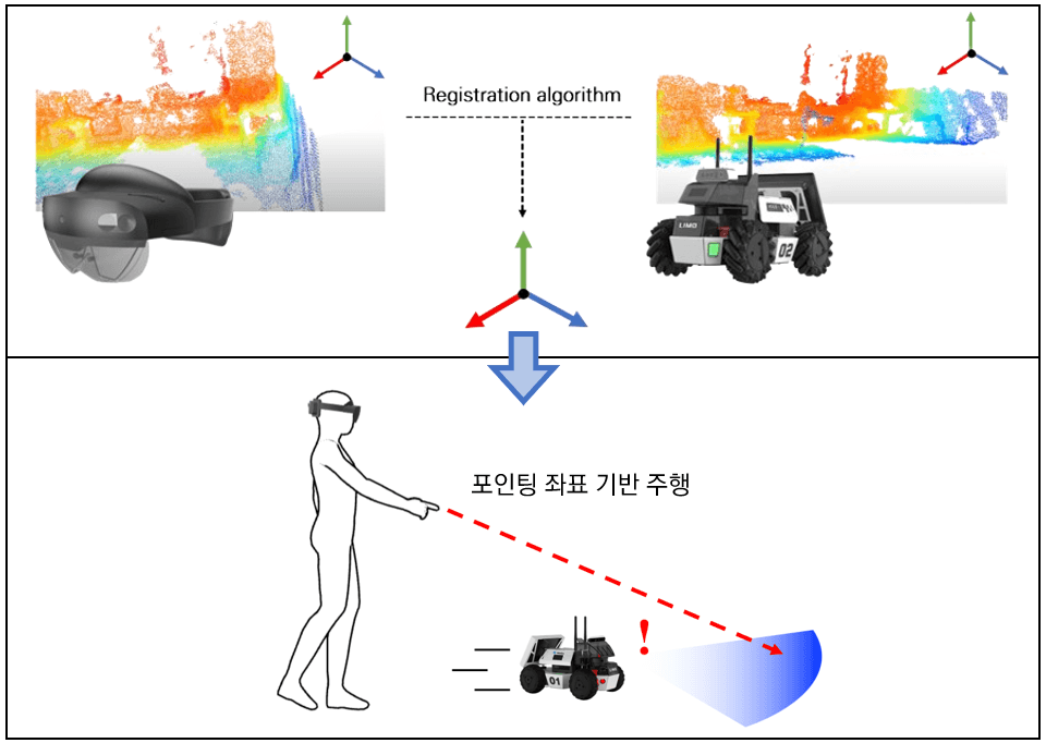 본 기능은 HoloLens 2의 포인팅(Pointing) 제스처를 통해 지정된 위치로 로봇을 이동시키는 공간정합(Spatial Registration) 기반 로봇 주행 제어 기능