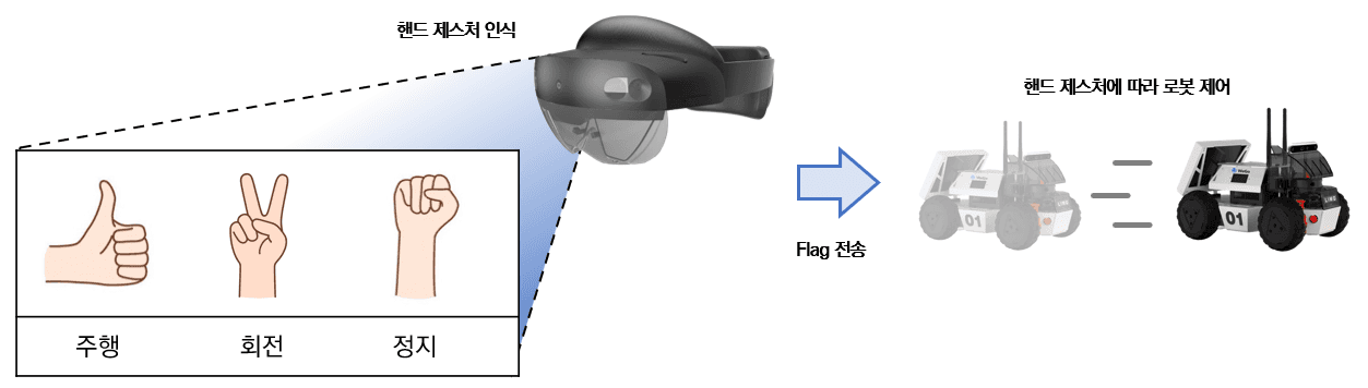 본 기능은 HoloLens 2 기반 XR 환경에서 사용자의 제스처 인식을 통해 로봇 주행을 제어하는 인터랙션 기능