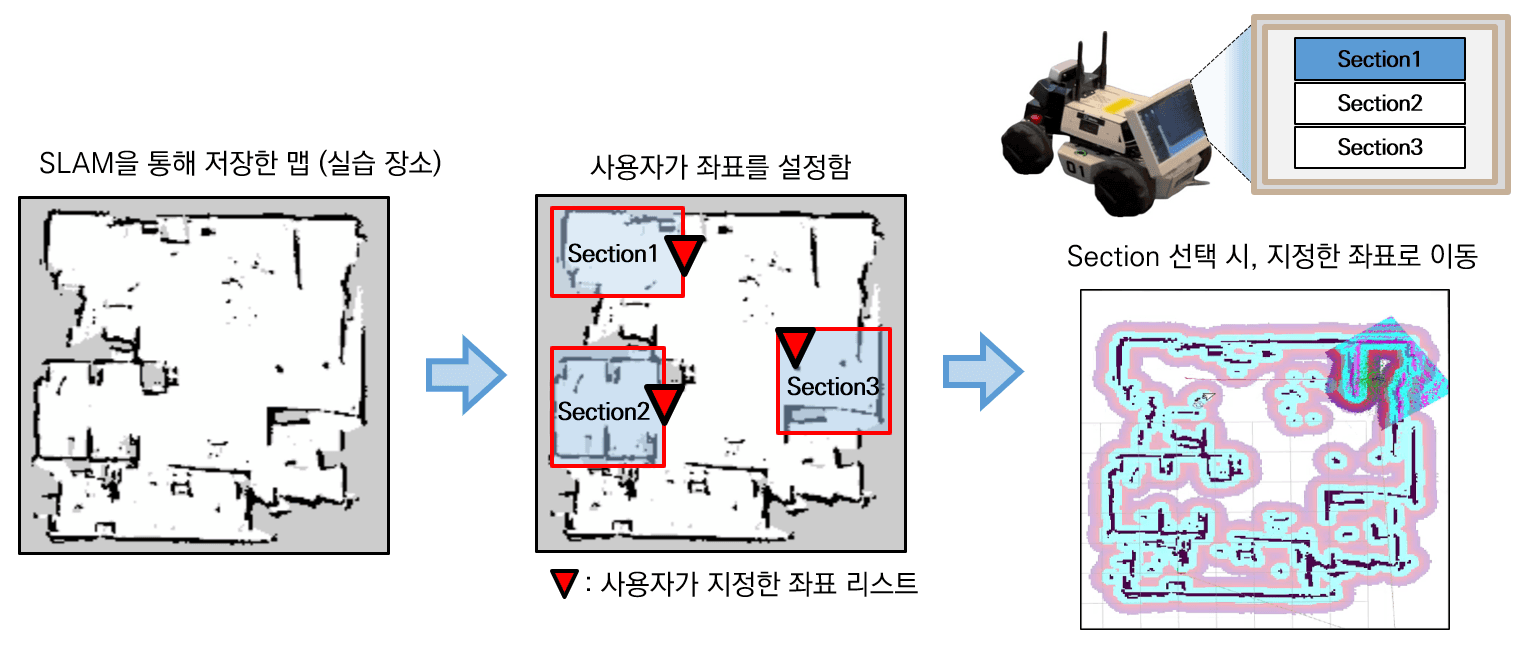 ROS 환경에서는 SLAM 맵 내 최적 경로를 탐색·생성하고 장애물을 피해가며 로봇이 선택된 목적지까지 안내함